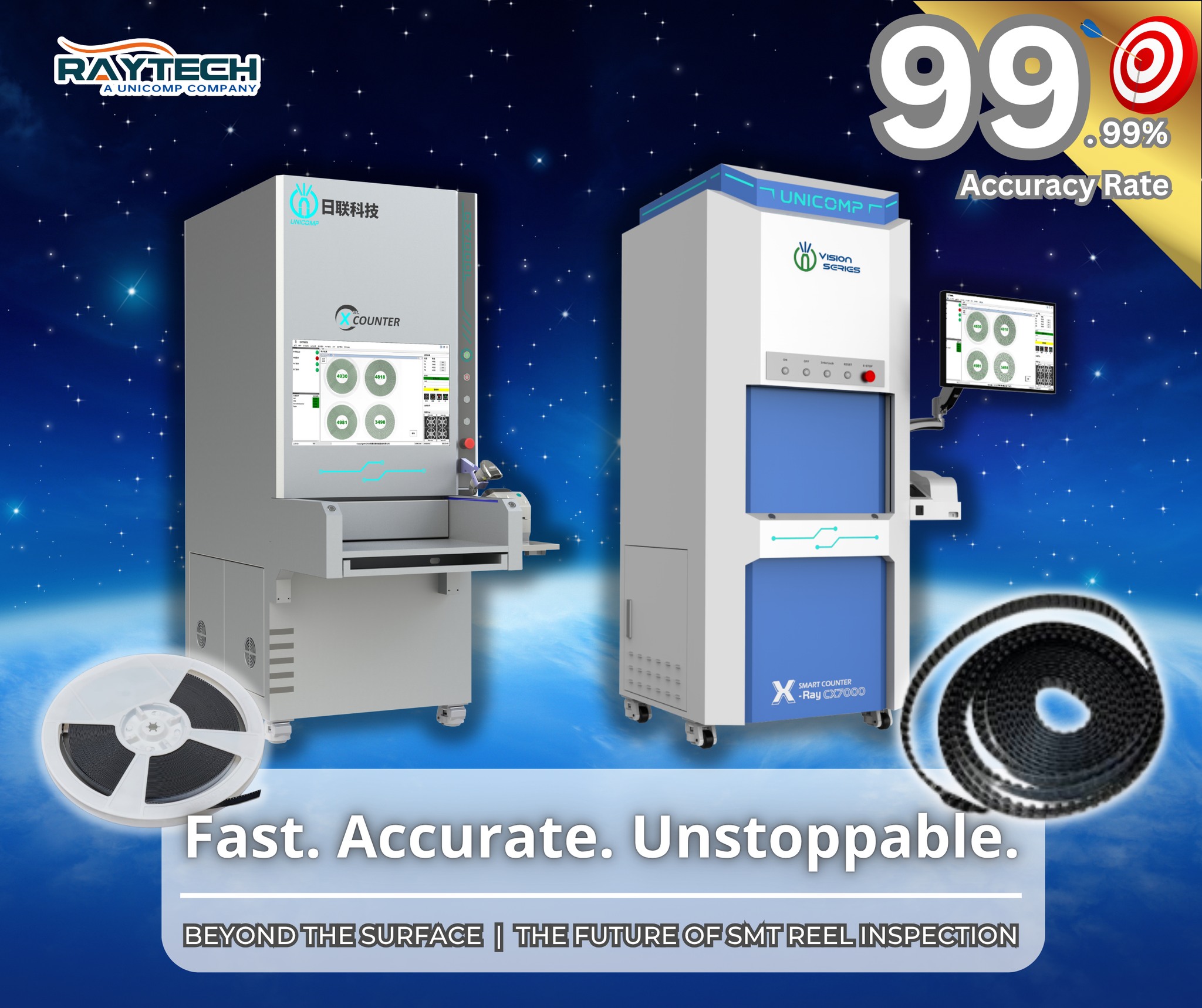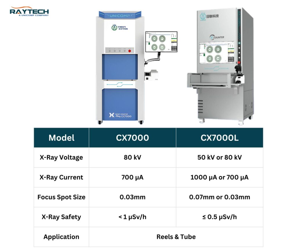 The Unicomp CX7000 Series — including the CX7000 and CX7000L — represents the next generation of Automated X-ray Inspection (AXI) systems designed for SMT reel counting and defect detection. These systems are engineered to deliver fast, accurate, and reliable inspection, ensuring every component counts.